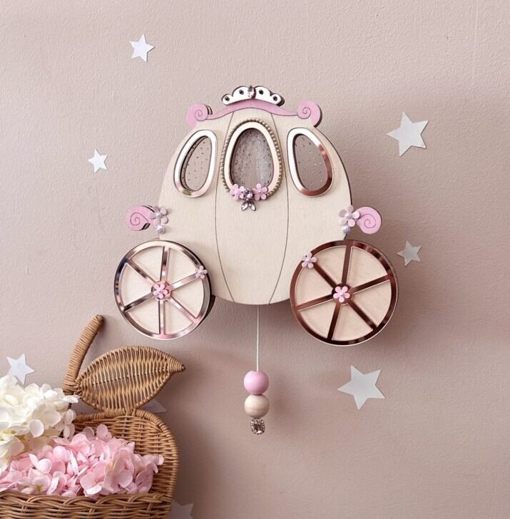 Sublime Boite à musique Carrosse avec de vrais détails de princesse : strass, perles, fleurs et diamants. Chaque petite fleur est faite à la main. Un vrai bijou qui ajoutera une touche de féerie à votre décoration. Le rétroéclairage permet de diffuser une lumière douce dans la chambre de bébé. Un petit boîtier lumineux, positionné à l’arrière de la boîte à musique, est rechargeable. Le câble vous est fourni. Vous pouvez changer la couleur ou l’intensité de la lumière à distance grâce à une télécommande.