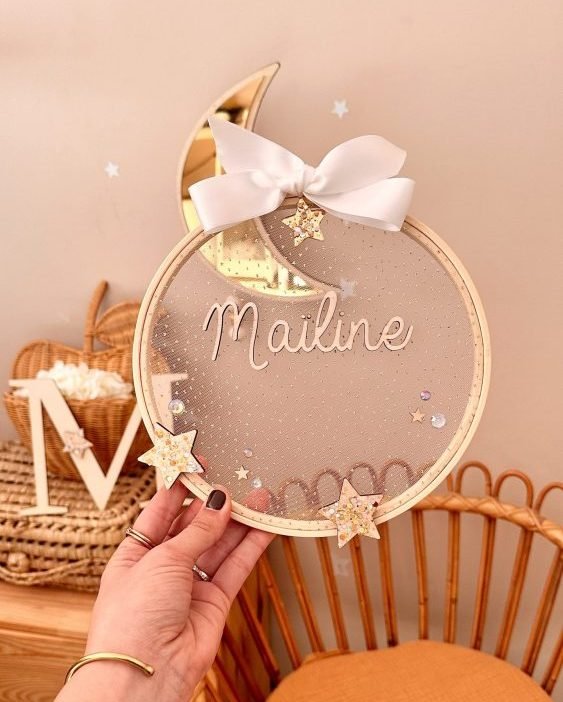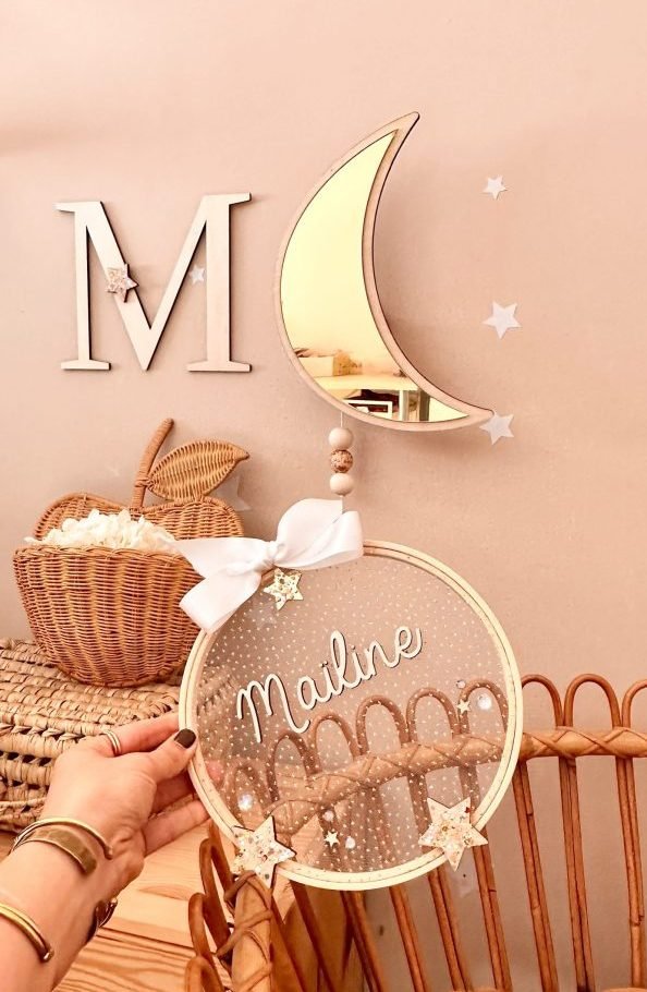 Sublime Boite à musique murale lune miroir or. Un design simple et épuré qui ajoutera une touche de rêve à votre décoration. Vous avez la possibilité d’y ajouter le prénom de bébé en blanc.