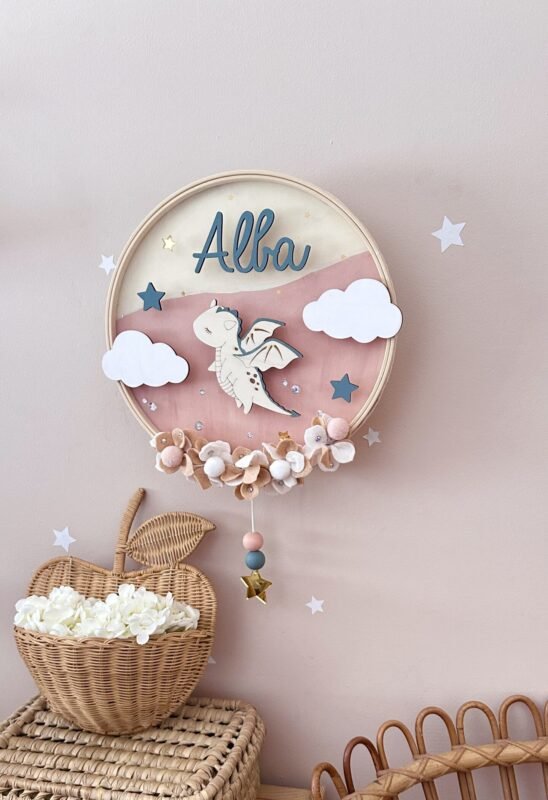 Sublime couronne dragon très poétique, ce petit bijoux ajoutera une touche de féérie à la décoration de la chambre de bébé. La couronne est montée sur un tulle blanc, le feuillage en feutrine est monté et découpé à la main. Si vous choisissez l’option de la “guirlande lumineuse”, ce modèle s’illuminera dans le noir, grâce à une guirlande led, les piles (CR 2032) sont fournies.
